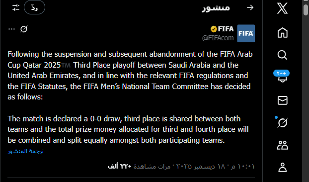انطلقت أمس مباراة قوية جمعت بين المنتخب السعودي وبين نظيره الإماراتي، وذلك ضمن منافسات كأس العرب لتحديد صاحب المركز الثالث والرابع، وقد بدأ الشوط الأول وتعادل المنتخبين بشكل سلبي، ولكن أثناء المباراة وبسبب الظروف الجوية تم تأجيل المباراة ثم إلغائها، وهذا مع جعل الفيفا تحدد بنفسها أصحاب المراكز الثالث والرابع، وعبر “أطلس” نوضح لكم التفاصيل، فكونوا معنا.